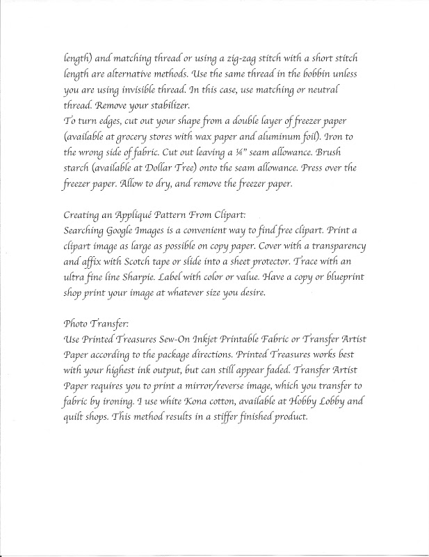 Iron freezer paper with the waxy side down. Then place another sheet on top and iron again. This keeps shrinkage from distorting the pattern. Trace the reverse image of the shape you want to applique. Cut it out and iron on the wrong side of fabric. Cut 1/4" around the shape. Use a paint brush to apply starch to a small section of the exposed fabric at a time. Press the fabric over the freezer paper.